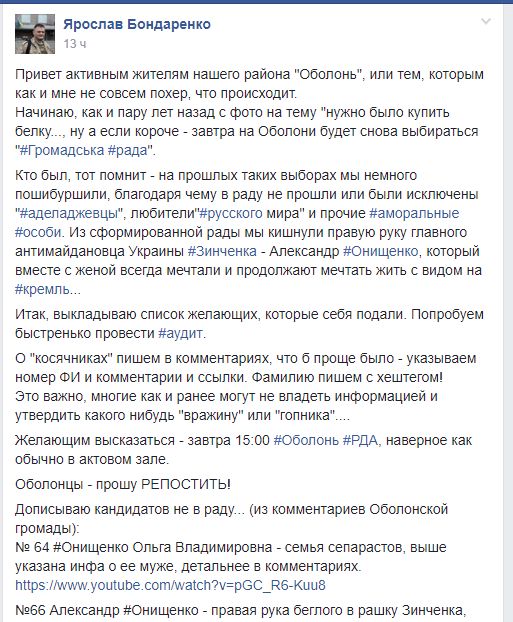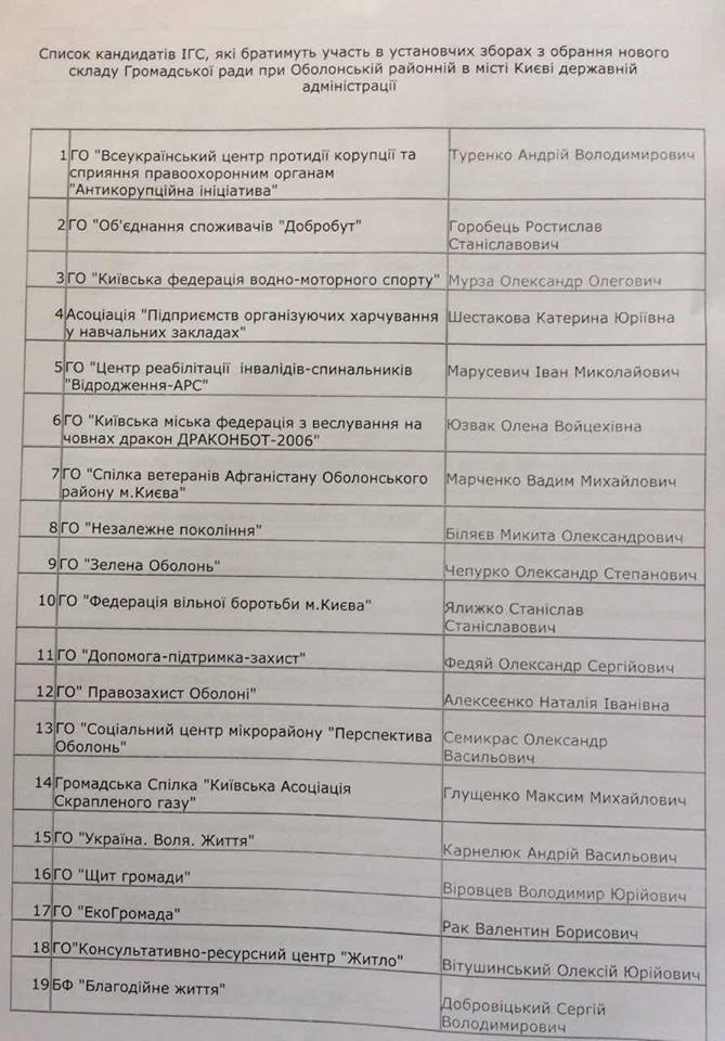 Общественный активист Ярослав Бондаренко в группе в Facebook «Громадськой варти Оболоні» опубликовал списки баллотирующихся в «Громадську раду» при Оболонской РДА кандидатов.