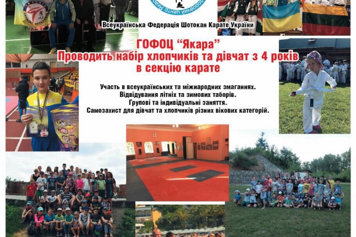Детская общественная организация физкультурно-оздоровительный центр "Якара" проводит набор мальчиков и девочек с 4 лет в секцию каратэ. Участие в областных, всеукраинских и международных соревнованиях. Посещение летних и зимних оздоровительных лагерей.