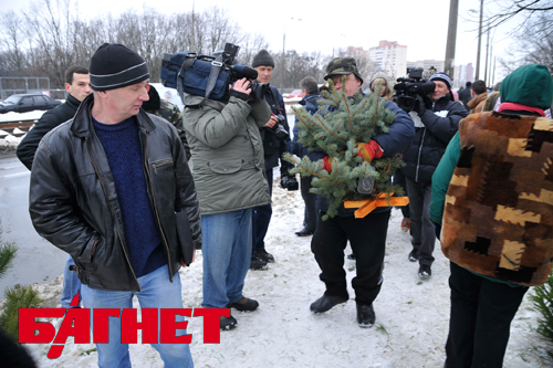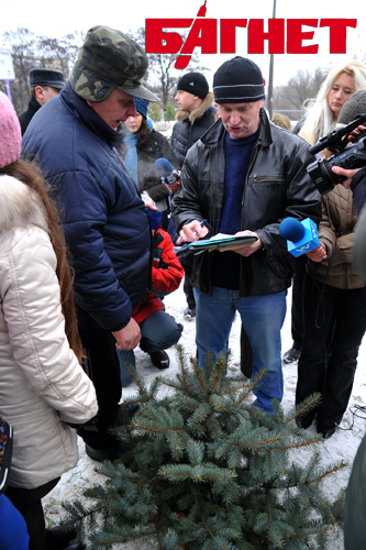 На проспекте Леся Курбаса (50-летия Октября) елочный базар расположился вдоль дороги. В грязном снегу стоят десятки зеленых красавиц, привлекая внимание и водителей, и прохожих. Представители СМИ появляются, как и договаривались: неожиданно, одной большой толпой.