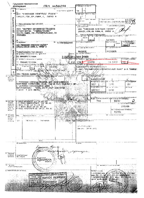 Как раз в тот же период, когда Хоменко уже не мог оттягивать тендер на закупку бланков документов МВД, за которыми выстроились очереди в том же МРЭО ГАИ, в МВД Украины поступил ряд официальных бумаг, свидетельствующих, что с «Укрэлеконом» не все чисто. Например, российское МВД прислало документы, свидетельствующие, что «НПП «Гаммаграфик» купил оборудование для производства ГЗЭ у одной из российских фирм всего за € 21670. Стоило сопоставить эту таможенную декларацию (см. фото документа) с договором лизинга (см. фото документа) о передаче оборудования «НПП «Гаммаграфик» государственному «Укрэлекону», как становилось ясным, что стоимость оборудования, за которое расплачиваются государственными деньгами, завышена в 20 раз! Кому, интересно, достается эта «разница» между € 21 670 (стоимость покупки оборудования «НПП «Гаммаграфик») и €2,6 млн. (стоимость передачи оборудования «НПП «Гаммаграфик» государственному «Укрэлекону»)?