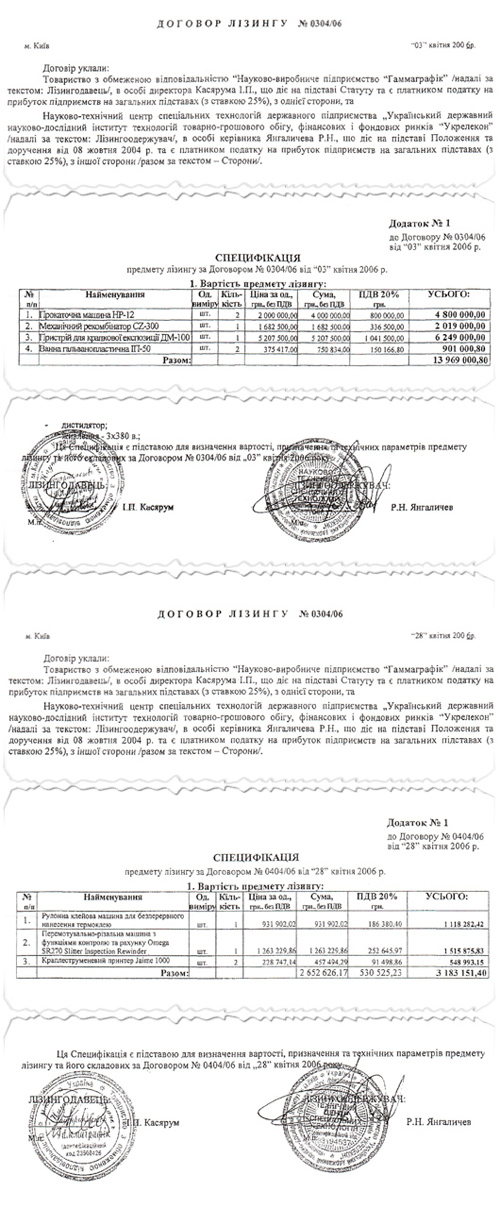 Договор лизинга между «НПП «Гаммаграфик» и государственным «Укрэлеконом», свидетельствующий, что госкомпания получила оборудование за 17152152 грн. (или примерно за €2,6 млн., по тогдашнему курсу НБУ). Получается, что когда в ход пошли государственные деньги «Укрэлекона», оборудование частного «Гаммаграфика» «подорожало» в 20 раз?!
