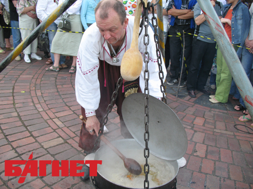 Больше всего людей собралось возле огромного котла, в котором варился настоящий казацкий кулиш. «Несколько столетий назад – это была основная пища в походах. Сейчас же кулиш немного подзабыли», - приговаривая угощал присутствующих главный «повар» Мирослав Шваб. – «В наше время правильно сварить казацкую кашу могут не многие. Приготовление кулиша — целое искусство. Даже подсмотрев ингредиенты, вам не удастся правильно его приготовить. Секретов масса. Например, кроме мяса в него добавляют свиные уши, именно они придают кулишу неповторимый вкус».