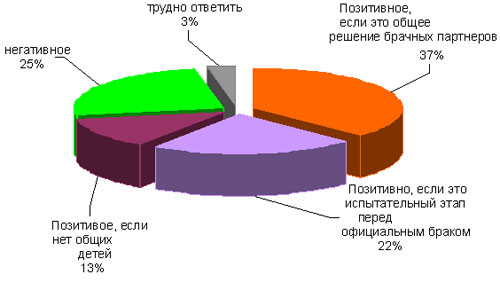 Так же она добавила, что незарегистрированный брак стал обычной формой организации семейной жизни. Эта форма отношений не рассматривается обществом как аномальное явление, и большинство населения относится к нему позитивно (См. диаграмму).
