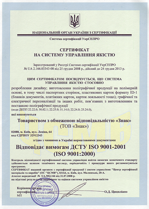 Справка Предприятие «Знак» входит в состав консорциума «ЕДАПС», созданного лидерами высоких технологий в Украине. Предприятие производит широкий спектр продукции: от простейших дисконтных карт до платежных чиповых карт и бланков документов. Мощности предприятия – 100 млн. пластиковых карт и 3 млн. поликарбонатных страниц для паспортов в год. По состоянию на 1 августа 2009 года предприятие выполнило свыше 550 проектов различной сложности по производству пластиковых карт, подписаны договора с более чем 100 украинскими и зарубежными банками на производство международных платежных карт. Предприятие является уполномоченным и сертифицированным производителем международных платежных систем VISA International и MasterCard Worldwide, Национальной системы массовых электронных платежей и межбанковской платежной системы «УкрКарт». В декабре 2008 года система управления качеством предприятия «Знак» сертифицирована аудиторской компанией «Bureau Veritas» согласно требованиям международного стандарта ISO 9001:2000 и Национальным органом Украины по сертификации согласно требованиям ДСТУ ISO 9001:2001. |