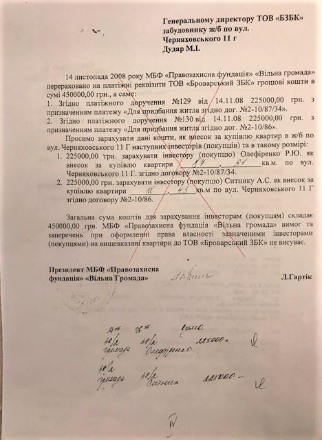 6. 17 ноября 2008 на счет застройщика поступили деньги в сумме 225 тыс. грн. - за Сытника заплатил благотворительный фонд "Правозащитная фундация "Свободная община", а остальные средства Сытник внес сам 19 ноября 2008.