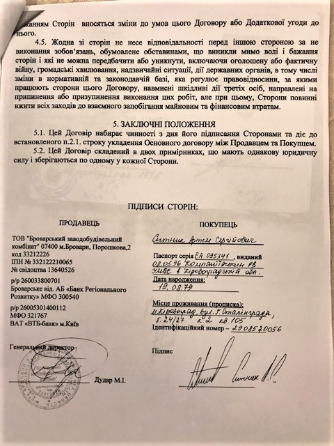 Опасаясь областного прокурора, который мог в любой момент парализовать работу предприятия, директор согласился и полгода спустя, 14 ноября 2008 года, был заключен предварительный договор №2-10/86, согласно которому "Броварський заводобудівельний комбінат" обязался предоставить Сытнику Артему Сергеевичу двухкомнатную квартиру площадью 82,6 кв.м. стоимостью 295798грн. в доме №11-г по улице Черняховского после того, как этот дом будет сдан в эксплуатацию.