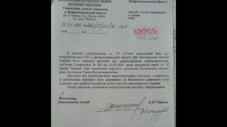 На днях депутату, лидеру фракции Самопомощь в Днепровском горсовете Юрию Акуленко сотрудники департамента защиты экономики Национальной полиции Украины вручили протокол о коррупции.