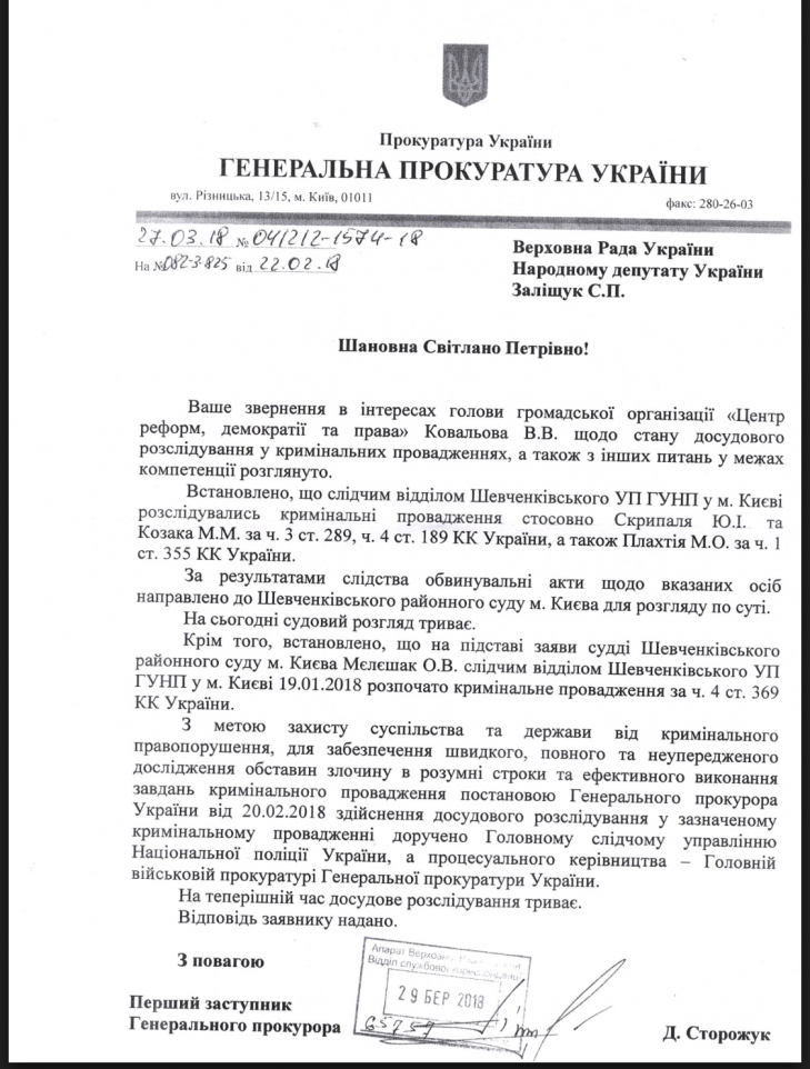 Об этом сообщил первый заместитель генерального прокурора Дмитрий Сторожук в ответ на обращение народного депутата Светланы Залищук, копии которого были переданы Центром демократии, реформ и права.