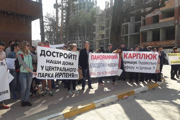 Ошукані інвестори сподівалися на допомогу Ірпінської міської ради, саме тому мерія стала кінцевою точкою протестної акції. Понад 200 людей з плакатами вийшли на головну площу Ірпеня зі зверненням до влади, зокрема до мера міста. Натомість міський голова Карплюк на вимоги громади допомогти у складному питанні лише зазначив: “Моя персональна думка — ви помилились з забудовником”