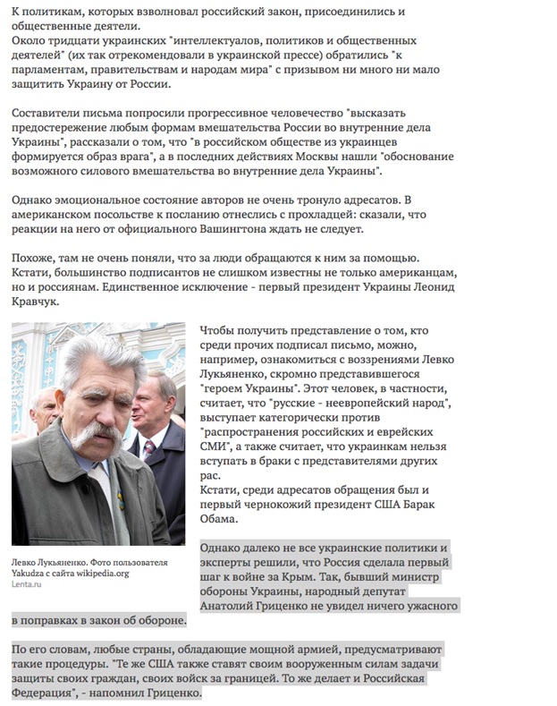 «Однако далеко не все украинские политики и эксперты решили, что Россия сделала первый шаг к войне за Крым. Так, бывший министр обороны Украины, народный депутат Анатолий Гриценко не увидел ничего ужасного в поправках в закон об обороне.