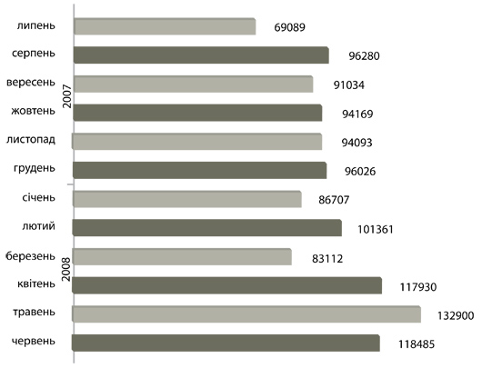 7. Динаміка поставки паспортів громадян України для виїзду за кордон з липня 2007 р. по червень 2008 р.