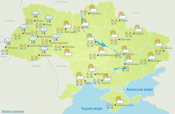 В западных областях ожидается +21 +29 градусов. На востоке воздух прогреется до +29 +32 градусов. В центре температурный максимум составит +33 градуса. На севере Украины, по данным синоптиков, будет 28-30 градусов тепла, на юге - 28-33 градуса тепла.