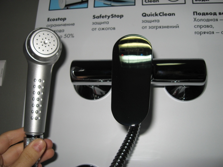 1) Самый комфортный и безопасный вариант – это настенный термостат для душа с присоединенной к нему гигиенической лейкой. Он же и самый дорогой среди прочих вариантов.