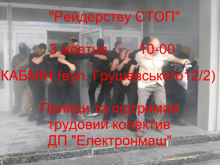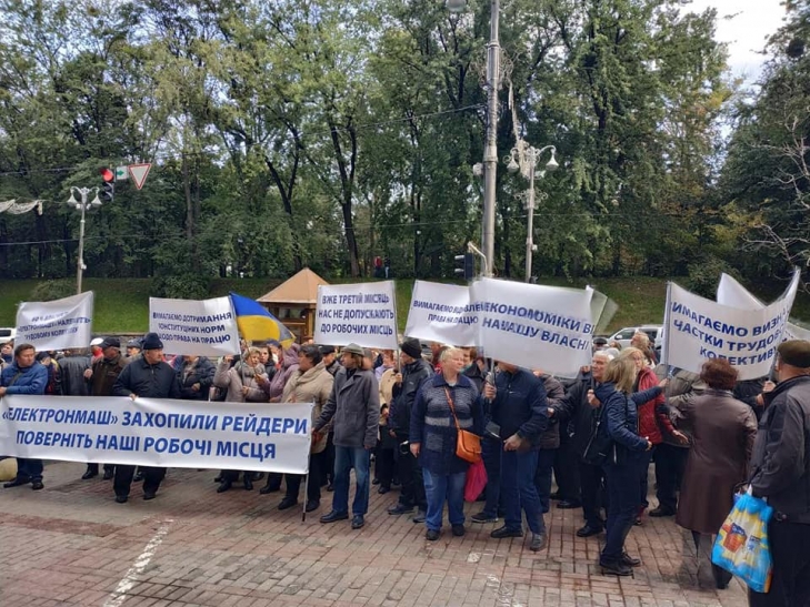 В акції протесту проти рейдерського захоплення держпідприємства прийняли участь сотні робітників «Електронмашу». За словами нардепа від Радикальної партії Дмитра Лінька, який прийшов підтримати трудовий колектив, це питання вже декілька разів піднімалося перед прем'єром Володимиром Гройсманом та Верховною Радою.