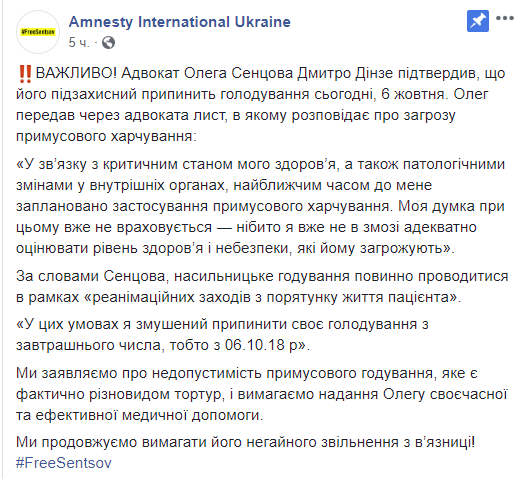 Как сообщалось, Олег Сенцов прекратил голодовку. Российская сторона официально сообщила о заявлении Сенцова, однако причин не назвала. По словам адвоката Сенцова, решение о прекращении голодовки принято после того, как российские врачи и тюремщики выдвинули ультиматум Сенцову, предложив либо добровольно прекратить голодовку, либо согласиться на принудительное кормление.