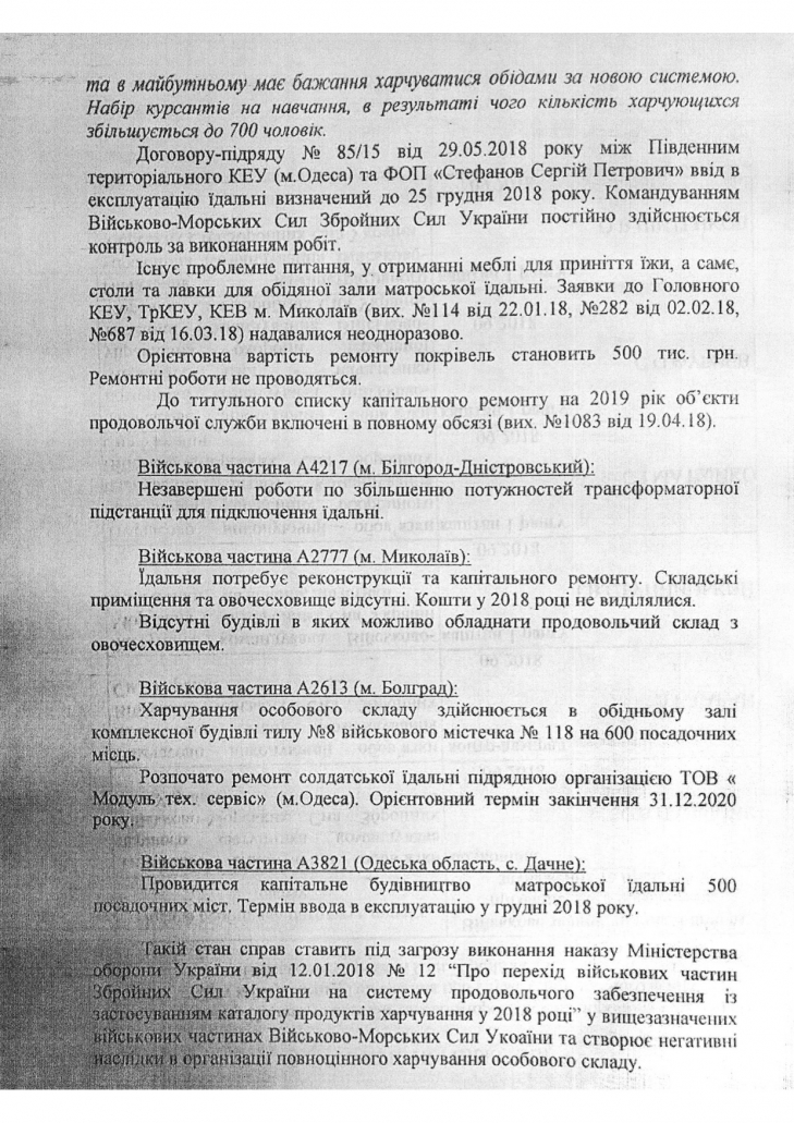 Мы не сомневаемся, что главковерха накормили хорошо, но вынуждены учитывать не только реакцию вкусовых рецепторов. "Работы не начаты в 12 столовых войсковых частей…"; "выполнены работы от 5 до 15% в 11 столовых войсковых частей…"; "169 УЦ (пгт Десна) из 4-х запланированных столовых капитальный ремонт завершается только в одной…"; "создалась критическая ситуация касательно обеспечения новым технологическим оборудованием вышеуказанных столовых..." Это — выдержки из письма командующего Сухопутными войсками генерал-полковника Сергея Попко заместителю министра обороны генерал-лейтенанту Олегу Шевчуку. "Такое положение вещей ставит под угрозу выполнение приказа Министерства обороны №12 от 12.01.2018, — предупреждает Попко. — И создает негативные последствия в организации полноценного питания личного состава". Документ датирован 27 сентября с.г. — за месяц до объявленного перехода частей ВСУ на питание "по-новому".