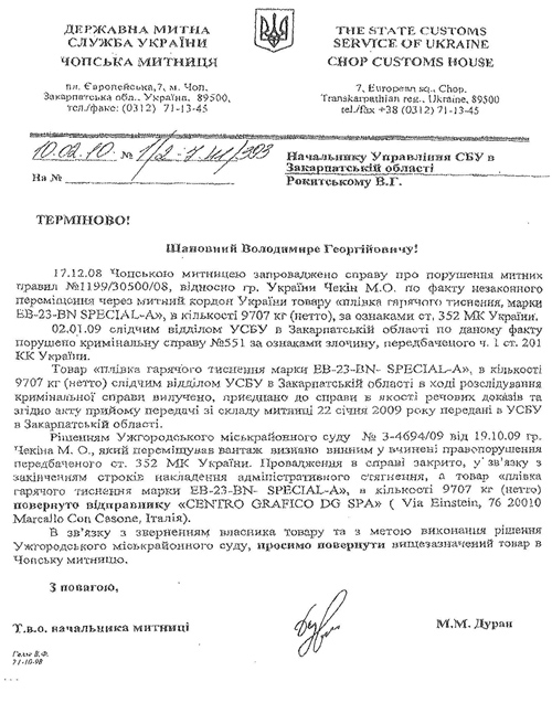 Судя по всему, несмотря на всю показную «крутость», они это прекрасно понимают и опасаются. Поэтому в эпистолярном жанре продолжают разыгрывать бурную деятельность. При этом Штробля теперь решил не подставляться, а задействовал своих подчиненных. Как следует из письма временно исполняющего обязанности начальника Чопской таможни некто М.М. Дурана на имя начальника УСБУ в закарпатской области Рокитского В.Г. (см. ниже фото документа), таможня просит УСБУ вернуть изъятую полиэфирную пленку. Показательно, что письмо направленно с грифом «СРОЧНО». Видать, ручные таможенники Балоги почувствовали, что, несмотря на зиму, под ними начинает гореть земля.