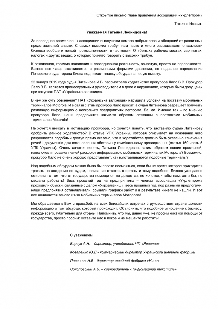 Свое открытое письмо главе правления ассоциации "Укрлегпром" адресовали директор ЧП "Ярослав" А.Н. Барсук, коммерческий директор Украинской швейной фабрики Ю.Д. Коваленко, директор швейной фабрики "Нина" Н.В. Пасечник и соучредитель "ТК-Домашний текстиль" А.Б. Соколовский.