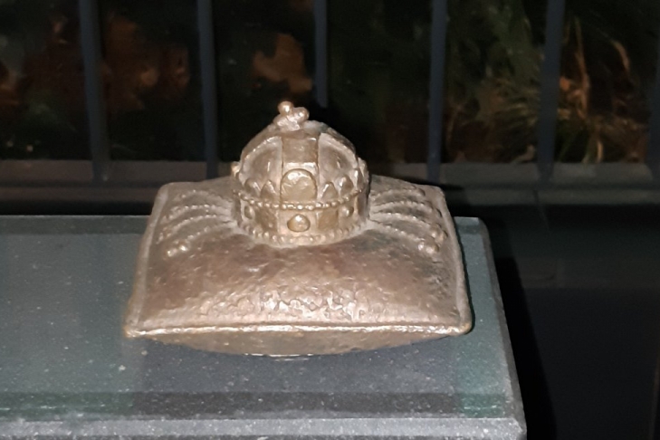 Сверху на камне установлена бронзовая мини-копия короны Святого Иштвана на подушке.