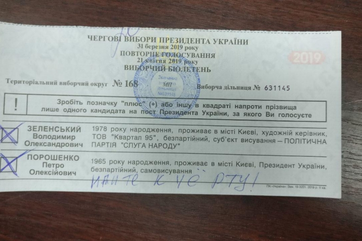 Более 2% избирателей, принявших участие во втором туре выборов президента Украины между Петром Порошенко и Владимиром Зеленским, испортили свои бюллетени.