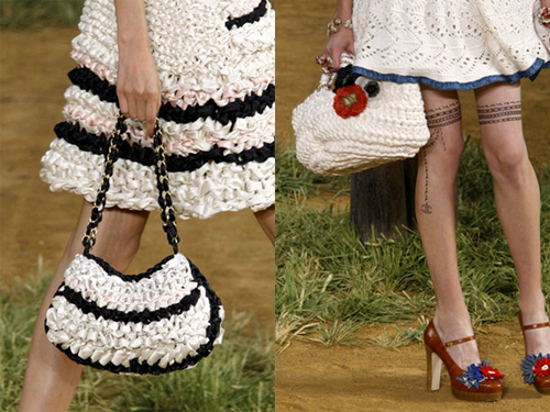 Корзинки, вязанные сумки, сумки из натуральных материалов незаменимы в летнее время. Материалы для этих сумок могут быть разные: дерево, солома, лоза, сизаль, рафия, кожа, текстиль. В коллекции Chanel белые и черные вязанные сумочки выполненные в крупной вязке, из шелковых лент и шерсти, украшены яркими красными, белыми и черными маками.