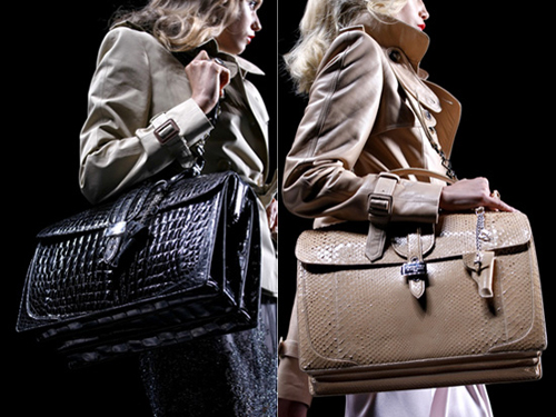 Сумка-саквояж классической формы может быть черной, белой, бежевой, коричневой, выполненной из кожи змеи, ящерицы, крокодила. Саквояж, как правило, должен быть небольшого размера, иметь одноцветную или контрастную вставку, небольшую ручку (или две ручки). «Диор» и Гальяно предлагают классические деловые портфели из кожи рептилий с серебристой фурнитурой и декоративными кожаными брелоками.
