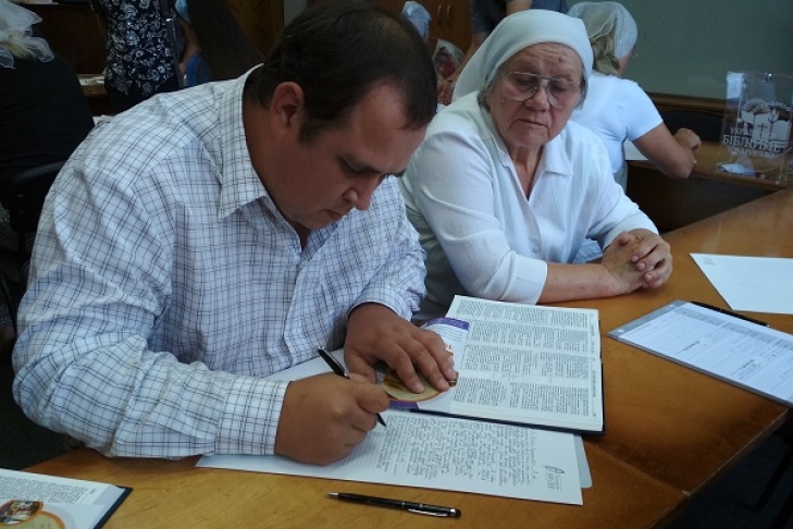 Затем эти переписанные листочки будут сшиты в одну большую Библию, которая будет храниться в Библейском обществе в центре Киева, но, как отмечает господин Юрий, рукописная книга сначала будет "путешествовать" по Украине, ее будут передавать от церкви к церкви. Кроме этого, будет создана книга памяти, где будут записаны имена тех, кто переписывал священное писание.