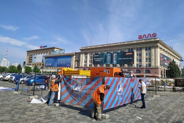 В центре Харькова коммунальные службы обнесли ограждением территорию вокруг волонтерской палатки на площади Свободы.