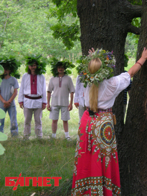 Потом волхвиня прислонившись всем телом к дубу, просила у Перуна дать присутствующим мужчинам мужскую силу. Все мужчины в это время стояли вокруг. Надо сказать, что представителей сильной половины человечества было немало – несколько десятков. Причем к этому действу присоединились даже скептики, говорившие ранее про секту. Почему бы не попробовать - авось поможет. Остались в стороне лишь те, кто не мог оторваться от работы: два телеоператора и повар Мирослав Шваб, который был занят приготовлением праздничного кулиша.