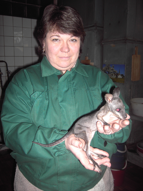 Жизнь новорожденного кенгуренка валлаби – экстраординарная история, говорят в зоопарке. В возрасте нескольких дней кенгуренок выпал из маминой сумки, еще слепым и совсем беспомощным. Родная мать отказалась принимать назад отпрыска, поэтому незадачливого беглеца «усыновила» женщина - заведующая отделом приматов Валентина Дикарева.
