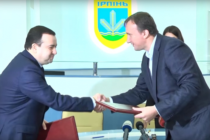 На фото: Голова ДАБІ Олексій Кудрявцев і мер Ірпеня Володимир Карплюк благословляють схему заробітку на дозволах забудованикам