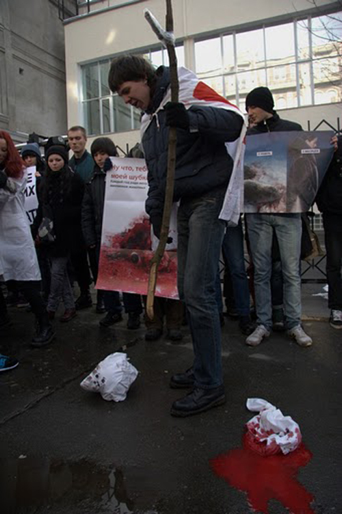 После пикетирования посольства Канады, активисты продолжили акцию на Львовской площади с целью привлечь внимание общественности к жестокому истреблению детенышей гренландского тюленя ради миллиардных прибылей меховой индустрии.