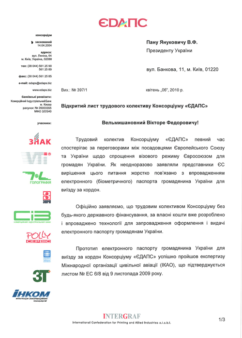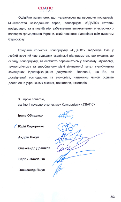 В своем письме, трудовой коллектив Консорциума официально заявил, что, невзирая на все преграды государственных мужей из Министерства иностранных дел, «ЕДАПС» готов незамедлительно и в полной мере обеспечить каждого гражданина Украины электронным паспортом, который полностью отвечает всем требованиям Евросоюза. Консорциум «ЕДАПС» официально приглашает Президента Украины Виктора Януковича посетить украинские предприятия с целью ознакомления с отечественными технологиями: