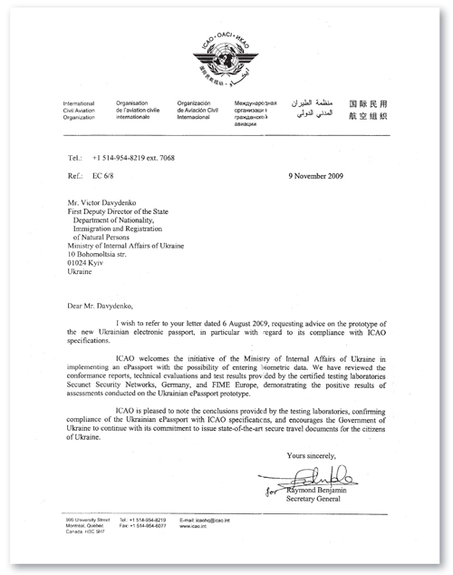 Генеральний Секретар цієї організації Раймон Бенжамин, у своєму листі повідомив, що ІКАО, проаналізувавши звіти щодо відповідності стандартам, технічні оцінки та результати тестування, надані сертифікованими лабораторіями Європейського Союзу, підтверджує, що український електронний паспорт відповідає всім специфікаціям ІКАО та вимогам Європейського Союзу. Також Генеральний секретар заохочує Україну продовжувати виконувати свої зобов`язання щодо видачі новітніх захищених документів громадянам України».
