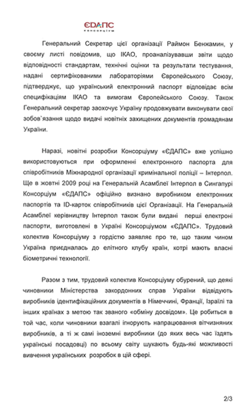 «Прототип електронного паспорту громадянина України для виїзду за кордон Консорціуму «ЄДАПС» успішно пройшов експертизу Міжнародної організації цивільної авіації (ІКАО), що підтверджується листом № ЕС 6/8 від 9 листопада 2009 року.