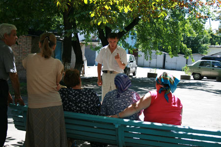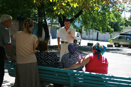 Внезапно перед скамеечкой появляется до омерзения прилизанный молодой человек (второй – не то напарник, не то стажер – все время прячется за деревом метрах в 30-и). «Вася», как, не сговариваясь, окрестила его наша редакция, хорошо поставленным голосом с места в карьер начинает пламенную речь. Его экспрессии могли бы позавидовать сектанты а-ля Аделаджа (впрочем методы воздействия на психику у них одинаковые).