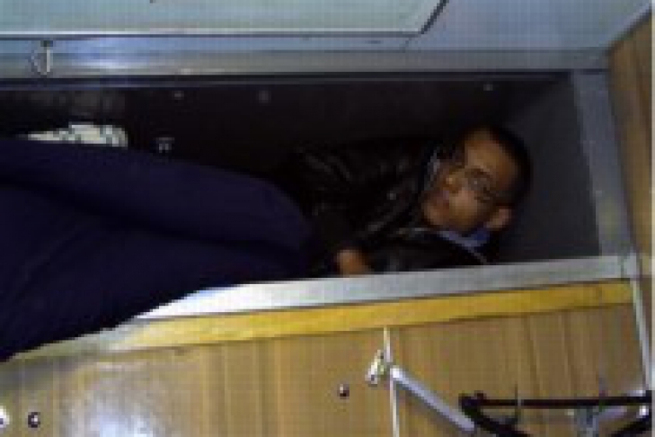 Пассажир поезда «Киев-Варшава» спрятался от пограничников в багажной нише под потолком своего купе. Чтобы остаться незамеченным, путешественник прикрылся матрасами и одеялами.