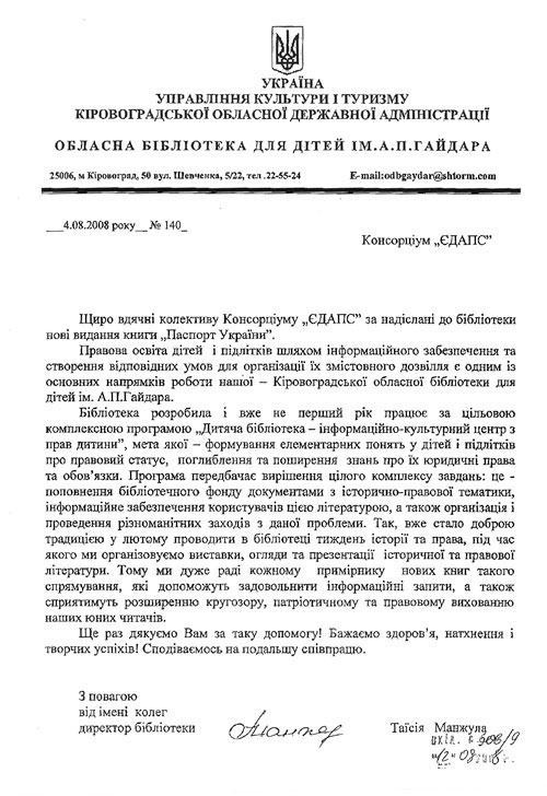 Кстати, уже есть первые отклики на книгу «Паспорт Украины». Как следует из ответных писем библиотек, им действительно пригодилось данное издание. По оценкам профессиональных библиотекарей, книга поможет удовлетворить информационные запросы на данную тематику, а также будет способствовать расширению кругозора, патриотическому и правовому воспитанию читателей (cмотри фото ниже).