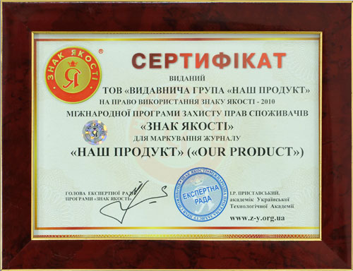 Как сообщает ИА "НАШ ПРОДУКТ", журнал «Наш Продукт» отмечен единственным на территории Украины официально запатентованным наградным знаком отличия «ЗНАК КАЧЕСТВА» (патент № 18206 зарегистрирован в Государственном реестре патентов Украины).www.bagnet.org),
