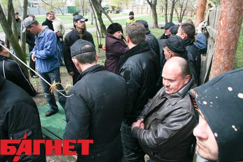 А забор вокруг стройплощадки тем временем охватывал все большую территорию. Вчера, 23 апреля, он сомкнулся, и на месте будущей застройки начали срывать асфальт. Бесперебойную работу обеспечили люди в камуфляже со щитами и неизвестные в гражданском, которые, к слову сказать, находились в состоянии не вполне трезвом, и вели себя очень агрессивно.