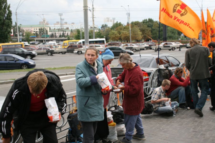 Не знаю, то ли начало учебного года сказалось на качестве митингующего материала (шатающейся без дела, но прилично выглядящей молодежи поубавилось), то ли «десятники» схалтурили и, экономя средства для своего кармана, набирали участников за бутылку… Добрая половина собравшихся под Минтрансом очень напоминала тот чудный контингент, который никак не могли выселить с Майдана аж до инаугурации Ющенко. Помните, после «оранжевой революции» возник спрос на профессиональных пикетчиков, способных разбить палатки где угодно и жить в них столько, за сколько заплатят? Одуревшие от вольготной и сытной жизни маргиналы шарились по столице, устраивая «городки протеста» под незаконными стройками, министерствами, Секретариатом, в Мариинском. Все эти «Коалиции ветеранов оранжевой революции» и «Советы полевых командиров». Вольница продолжалась ровно до тех пор, пока вид и, согласитесь, запах «борцов за народное счастье» не начал бросать густую тень на заказчиков акций.