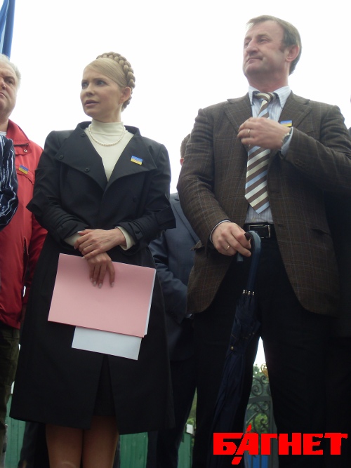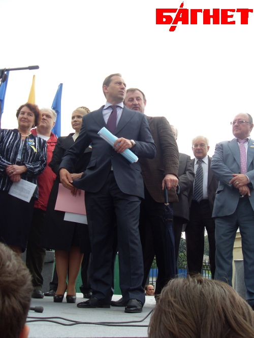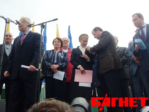 Через какое-то время практически к самой сцене на черном Мерседесе подъехали лидер Блока своего имени Юлия Тимошенко и вице-спикер парламента Николай Томенко.