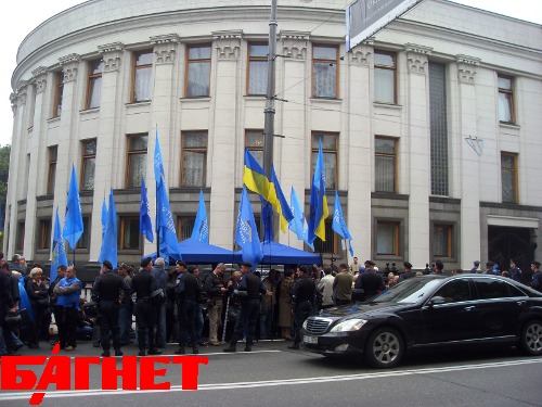 На улице Грушевского, а также непосредственно возле входа в Раду выставили свои палатки и флаги сторонники Партии Регионов. Их окружали правоохранители, не допускающие к зданию посторонних людей.