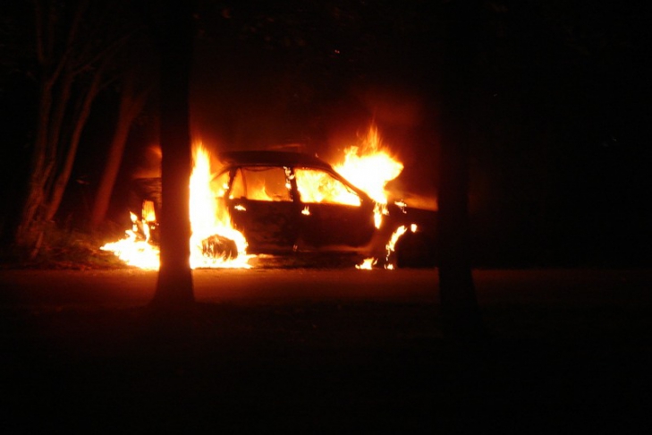 Два человека в спецодежде облили «Митсубиши» какой-то смесью и подожгли