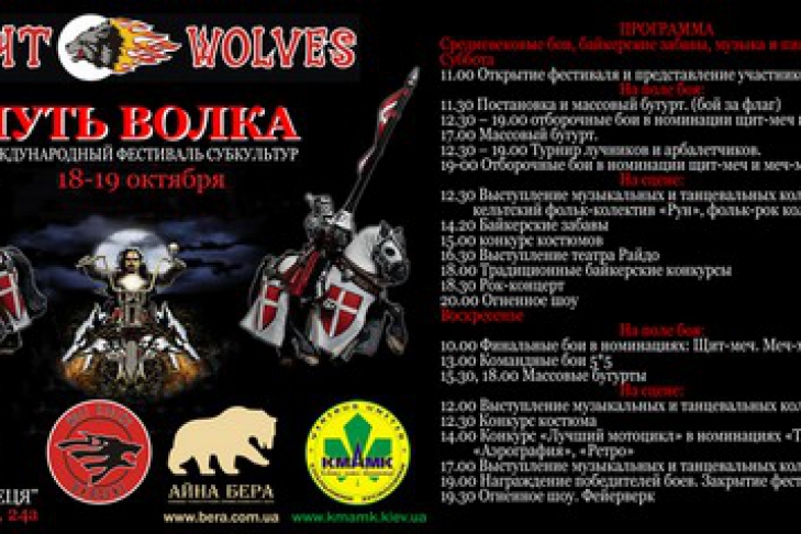 22-23 мая на Долобецком острове (станция метро «Гидропарк») состоялся фестиваль субкультур «Путь волка». Большую часть гостей составляли родственники и знакомые рыцарей, участвовавших в действе, случайные же отдыхающие были удивлены, если не сказать шокированы. Представьте себе: посреди Гидропарка рыцарей в средневековых доспехах, бьющихся на мечах. Как всегда на подобных фестивалях, возле «поля боя» дежурила «скорая». К счастью, в бессознательном состоянии после ударов тяжеленным мечем по голове, никого не увозили, были лишь мелкие травмы.
