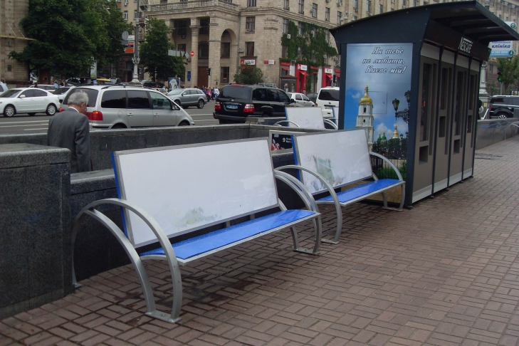 На днях вдоль Крещатика, возле подземных переходов, появились новенькие бело-голубые скамейки с рекламными площадями на спинках.