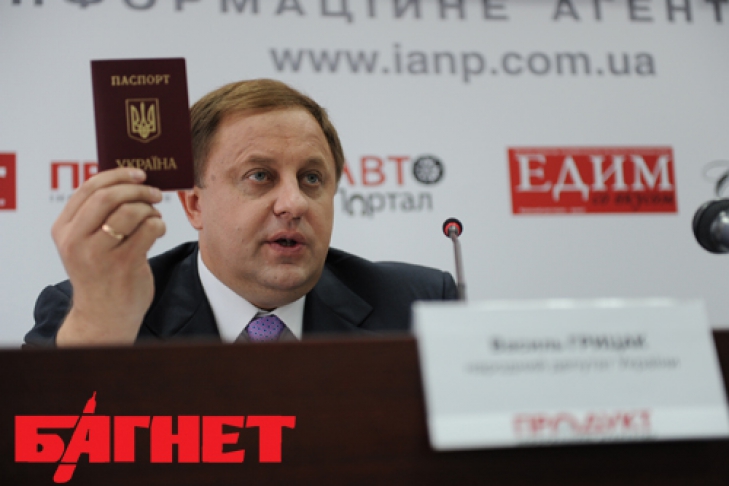 Народный депутат Украины Василий Грицак в ходе пресс-конференции на тему «Раскрыты коррупционные схемы продажи украинского гражданства и паспортных документов в Приднестровье чиновниками МИД Украины», которая проходит в ИА «НАШ ПРОДУКТ», продемонстрировал загранпаспорт старого образца, купленный им за 5 тыс. долларов в Молдове.
