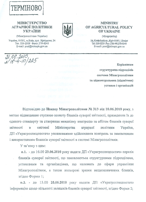10 июня 2010 Минагрополитики выпустило приказ №313, которым обязало все свои подразделения заказывать бланки документов строгой отчетности только у ГП «Украгроспецпостач» (находится в ведении Минагрополитики). А это несколько десятков бумажек: складские квитанции на зерно, товаро-транспортные накладные на перемещение спирта, паспорта коней, коров, простые и двойные складские свидетельства и т.п. Точное их количество, похоже, не знало и само министерство, поскольку согласно письму от 21 июня 2010 г. Минагрополитики обязало все свои подразделения представить перечень всех бланков строгой отчетности (см. ниже фото документа).