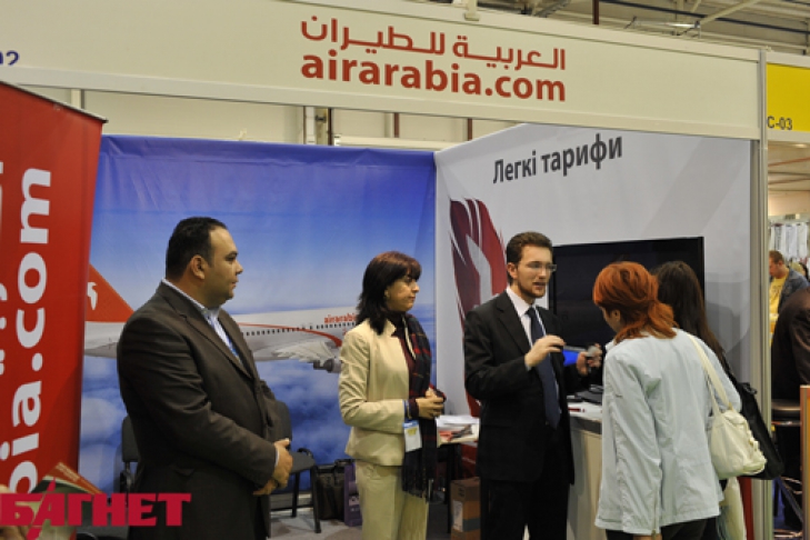 Посетители турсалона интересуются предложениями авиакомпании Air Arabia. На фото (слева на право): менеджер по маркетингу Air Arabia Шериф Хосни, региональный менеджер Air Arabia Шалини Раджан, представитель компании «ЕДАПС-ТМТ» - Генерального эксклюзивного агента по продажам билетов в Украине авиакомпании Air Arabia - Артем Дашковский