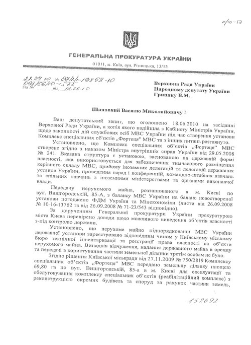История с комплексом специальных объектов «Фортеця» МВД заинтересовала не только журналистов, но и народного депутата Украины Василия Грицака. Он отправил соответствующий запрос в Генеральную прокуратуру, копией ответа на который мы располагаем.